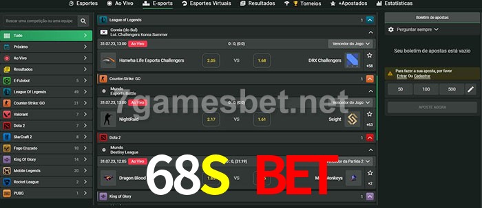 O 68S Bet oferece uma grande seleção de opções de apostas em e-sports com probabilidades competitivas